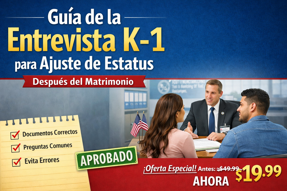 Prepárate para tu entrevista de Ajuste de Estatus por visa K-1 con claridad y confianza. Esta guía práctica te explica qué esperar, qué llevar y cómo evitar errores después de casarte en Estados Unidos. Incluye documentos, preguntas comunes, red flags y un checklist final para el día de la entrevista. Ideal para parejas que no quieren arriesgar su proceso y necesitan una preparación clara y directa. Precio especial: $19.99 (antes $49.99)